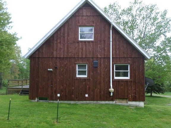 2 Bedroom Chalet built 1982 on 4.37 secluded acres on Connor road, in the Town of Maryland. Over 800 feet first floor, with full bathroom. Over 500 feet second floor for 2 bedrooms. Over 600 feet finished in basement. Basement has a full bath/Laundry room. There is a 2 car detached garage. Newer architectural shingled roof. Large deck on front and side of home.