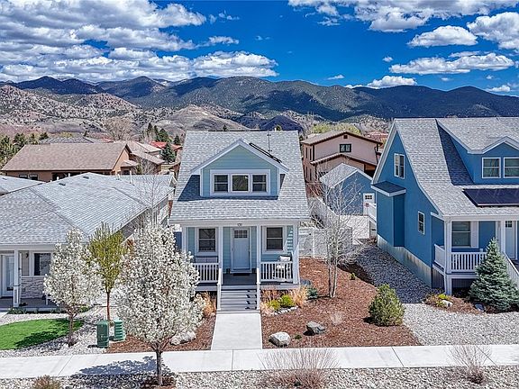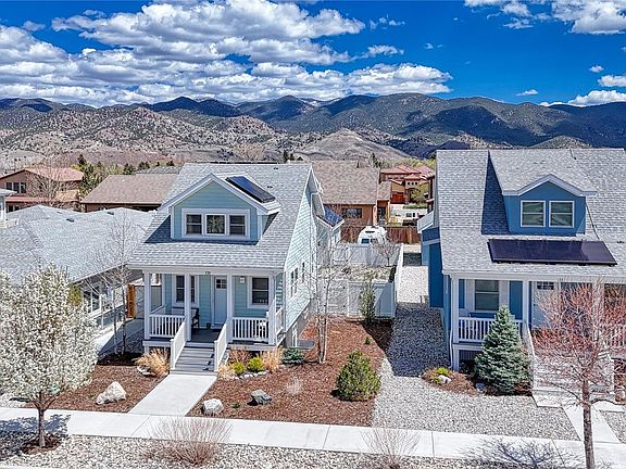 This home is 100% electric! This means there are no expensive gas bills. And because the home has solar power the electric bills average $6/month. This cute Cape Cod style home has 3 bedrooms, 2 1/2 baths is situated in the Crestone Mesa Subdivision. Located near the Salida Golf Course and has beautiful and big mountain views of the Fourteeners and is only a short walk or bike ride to downtown Salida. Start your day with a cup of coffee on this perfect cozy front porch. Large fenced backyard leads to an oversized one car garage and additional parking off the alley. This home has a thoughtful floor plan. Enter on the main level to the living, dining, kitchen and 1/2 bathroom. Upstairs, 2 bedrooms with vaulted ceilings and a full bath. The primary bedroom, bathroom and laundry in the basement. New radon system installed. Home has a water softener and house filter. In addition there is a reverse osmosis water filter at the kitchen sink. Seller tries to use only non-toxic cleaning products in the home. The home faces west towards the Collegiate Peaks. At the center of the neighborhood is a City maintained park which includes a community garden, gazebo for gatherings, and grass and play equipment. Located just a short walk or bike ride to downtown Salida to restaurants and shopping. Easy access to Frantz Lake, the Arkansas River and to nearby trails.