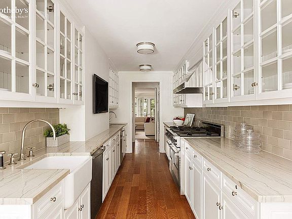 A wrought-iron gate leads to the idyllic front courtyard. Inside, a foyer welcomes you to the Garden Floor, with an eat-in kitchen, dining and living areas. The kitchen offers stainless-steel appliances, new oak floors, Luce de Luna quartzite counters and custom cabinetry. Surrounded by glass doors offering incredible natural light, the dining and living room overlook the bucolic private garden where you can relax and entertain.