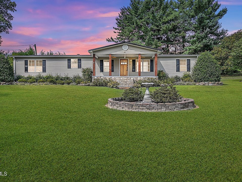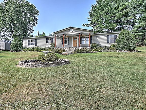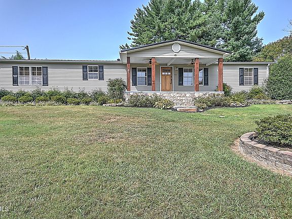 Excellent location with space to spare! This roomy doublewide sits on a peaceful, spacious lot with beautiful landscaping in the heart of Johnson City. From the covered front porch with ceiling fans and stately columns to the patio at the back of the home, there's no shortage of serene spots for outdoor relaxation. The large back yard features a firepit as well as a convenient building for storage or protecting lawn equipment. Inside, the living room and formal dining room are ready to welcome guests, while an open-concept family room at the back of the home offers a beautiful stone fireplace for cozy evenings. The home features four spacious bedrooms with new carpet and lots of closet space, and the primary bedroom has a large en suite bath with a shower and new tub, a double-sink vanity, and a large walk-in closet. The kitchen features stainless-steel appliances and lots of cabinet space. This home is only one minute from Woodland Elementary School and 8 minutes from both Liberty Bell Middle and Science Hill High schools. East Tennessee State University, the VA, and Johnson City Medical Center are also within a short 8-minute drive. With its prime location, this home offers unparalleled convenience to shopping, dining, entertainment, schools, hospitals, and more. Set up your private showing today!