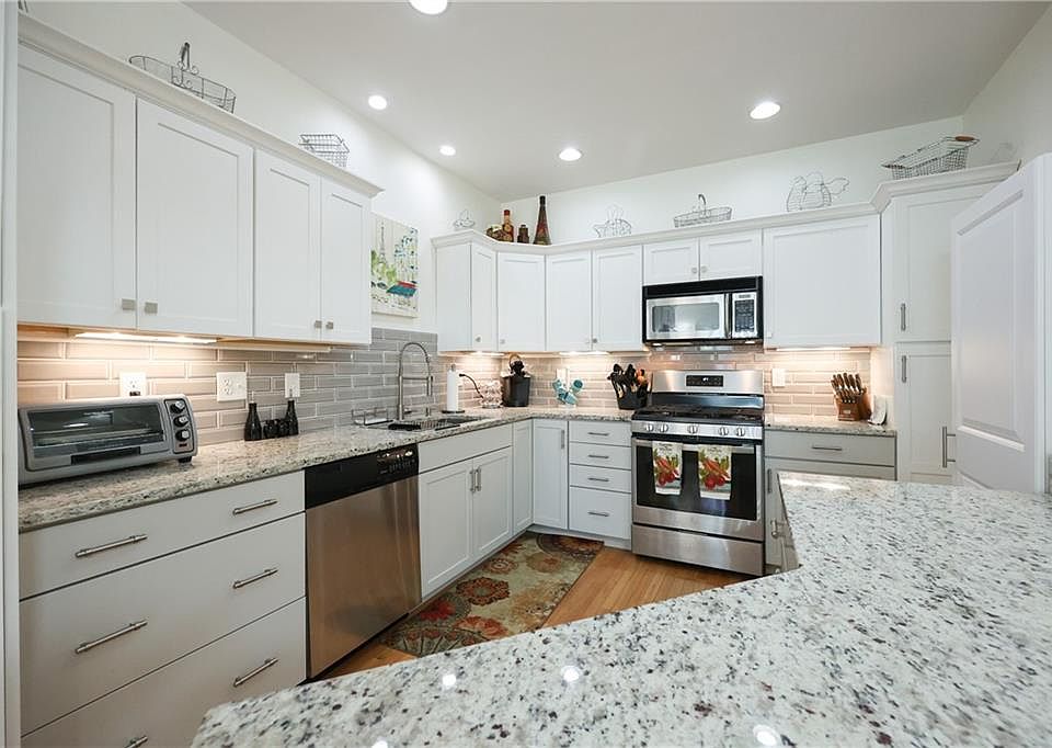 Whirlpool tubSeparate tiled showerBrand new soft-close cabinetsUpdated eat-in kitchenOversized bedroomsVaulted ceilingsGranite countertops