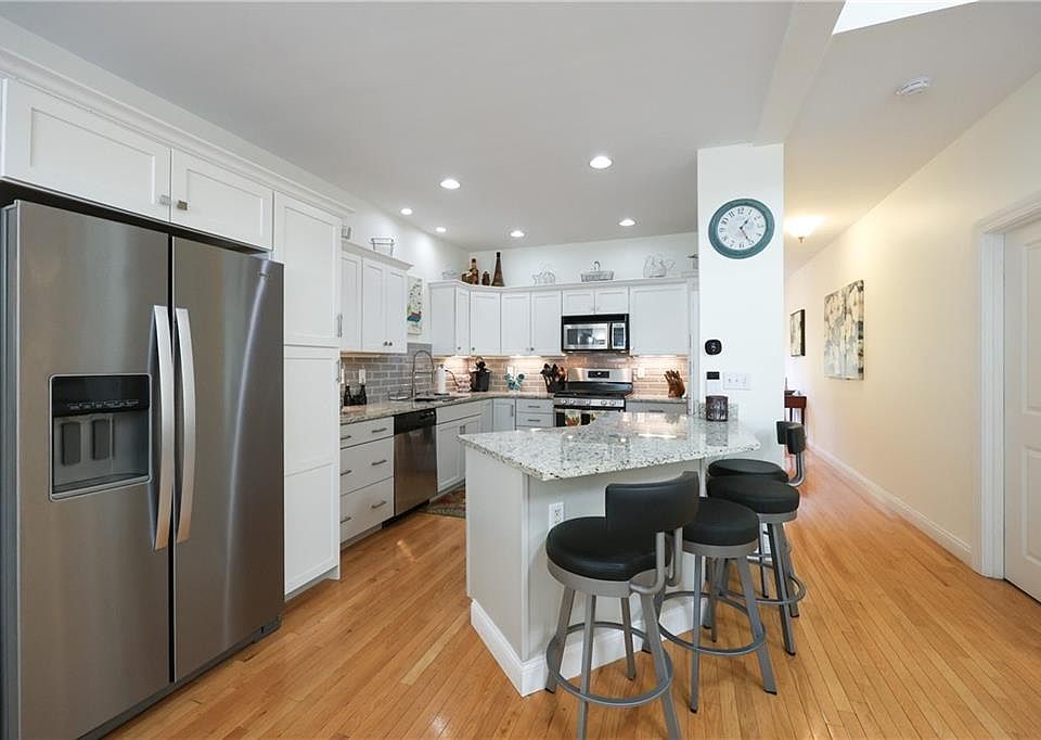 Large Townhouse Condo with 2,800 sq ft of space located in the desirable Fruit Hill neighborhood of Providence! Enjoy easy access to Providence College, Rhode Island College, Triggs Golf Course, parks, shopping, and restaurants. This sun-filled home features hardwood floors, vaulted ceilings, gas fireplace, skylights, A/C and plantation shutters. The modern eat-in kitchen boasts new soft-close cabinets, granite countertops, and stainless steel appliances (new refrigerator). Two spacious bedrooms include a luxurious primary suite with whirlpool tub, tiled shower, and walk-in closet. Recent updates include new central A/C, Navien tankless hot water system, and 200-amp electrical service. Enjoy your private deck, plus a garage and full basement for storage. Move-in ready and packed with upgrades—don’t miss this opportunity!