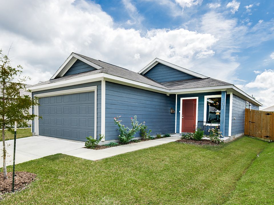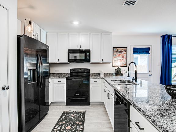 This 1 year old blue beauty is fresh, clean and cozy! Open the front door to a large and bright living area with beautiful LVP throughout. The living room has a fan to keep you cool in the warm months and the kitchen and dining area are well lit and ready to entertain. The kitchen has a fridge, microwave, dishwasher and range along with easy-to-clean granite and black fixtures. The washer and dryer will remain for your convenience, and are in the utility closet off the kitchen. Settle into the spacious primary bedroom with views of the garden boxes in the backyard, an ensuite bath with a shower and granite counter tops, as well as a large walk-in-closet. The other two bedrooms share a full size bath with granite countertops and a tub. Step outside to enjoy the well-maintained backyard lined with garden boxes and beautiful plants. With plenty of area to sit, and a fire pit for the colder months, this backyard is a perfect place to host friends and family. The community shares 2 pools, a basketball court, park, and playground.