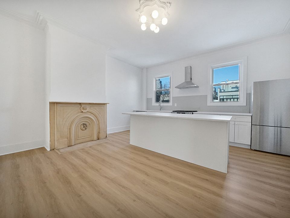 Spanning two sun-drenched floors, the apartment boasts brand new hardwood flooring throughout and soaring high ceilings adorned with original plaster moldings, preserving the building's rich history. Elegance is further defined by four original decorative marble fireplaces, serving as magnificent focal points.