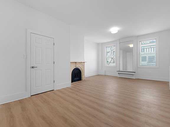 Spanning two sun-drenched floors, the apartment boasts brand new hardwood flooring throughout and soaring high ceilings adorned with original plaster moldings, preserving the building's rich history. Elegance is further defined by four original decorative marble fireplaces, serving as magnificent focal points.
