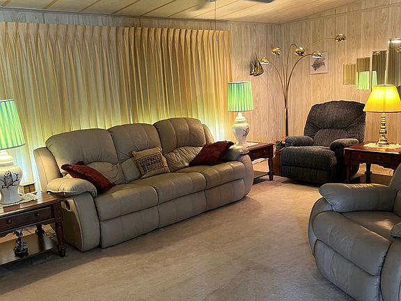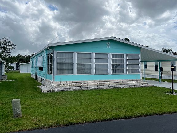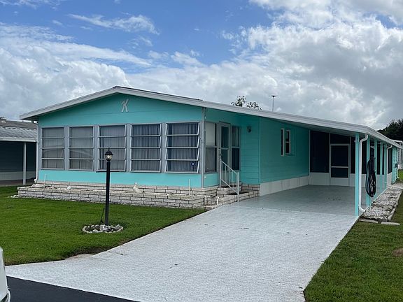 This home comes fully furnished and located in well maintained and gated 55+ Orange Manor West Mobile Home Community. Enjoy year-round warm weather, access to beaches and many outdoor activities. Large living room joins dining room with additional work area. Home has been nicely decorated and shows pride in ownership. Common area bathroom replaced in 2024, roof replaced in 2023, and exterior painted 2022. Low monthly fees which include cable, internet and trash pick up. This park offers a lifestyle, enjoy heated pool, billiards, mini golf, shuffle board, croquette, horse shoes and more! Washer and dryer are located inside the home.