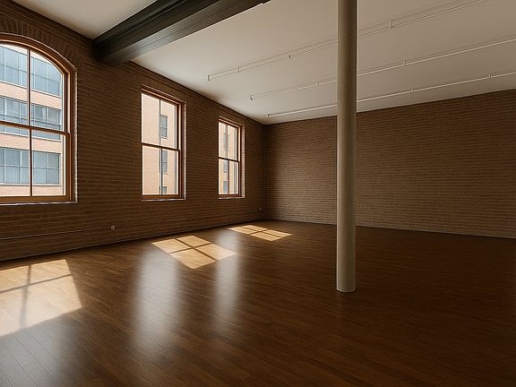 Oversized eastern-facing windowsExposed brick wallsFlexible home officeCast-iron columnExposed cast-iron beamSoaring ceilingsSleek modern finishes