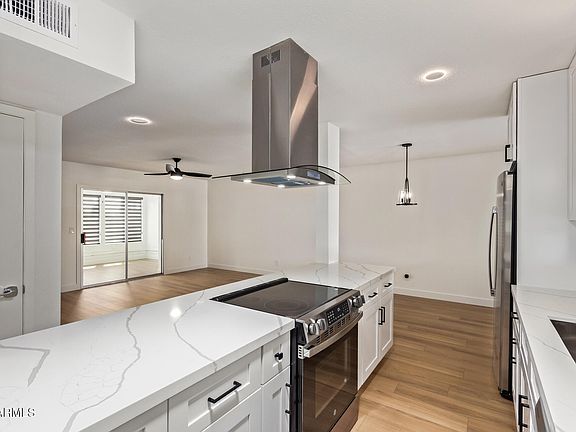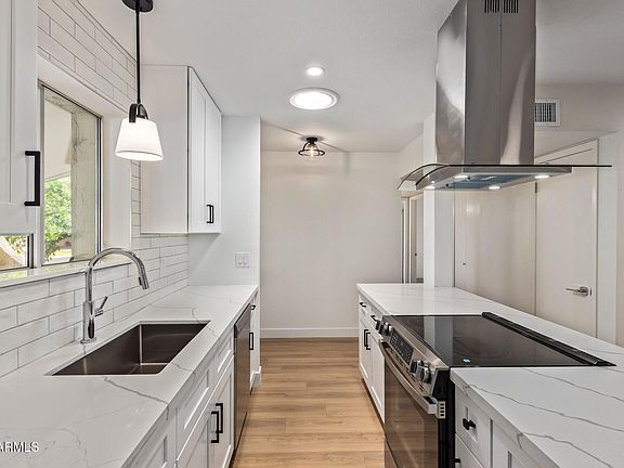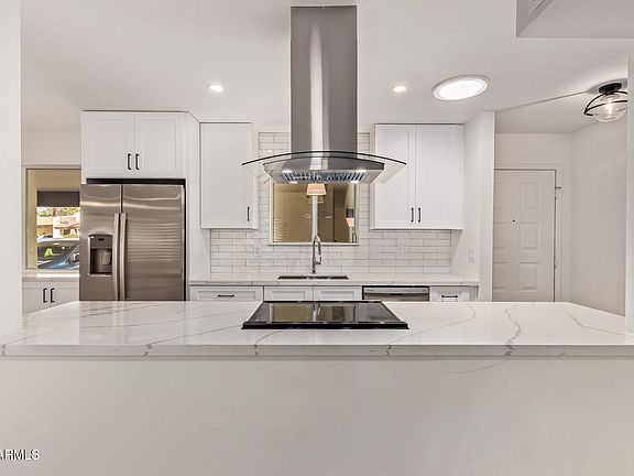 55 + beautiful and move-in ready patio home in the gorgeous Casa de Paz Community! Discover a grassy front yard, a carport space, and a welcoming courtyard for enjoying your morning coffee. The immaculate interior has wood-look floors, neutral paint, recessed lighting, and an open layout for entertaining. Cook delicious meals in the galley kitchen equipped with sleek quartz counters, stainless steel appliances, white cabinets, and a subway backsplash. Use the extended cabinetry as a coffee bar or dry bar. The primary bedroom has a walk-in closet, soft carpet, and a modern bathroom with a glass door shower. You will love the Arizona room all year round! The paved patio is great for gazing at your desert landscaping. NEW WINDOWS to be installed April 16.