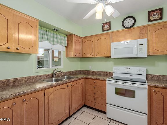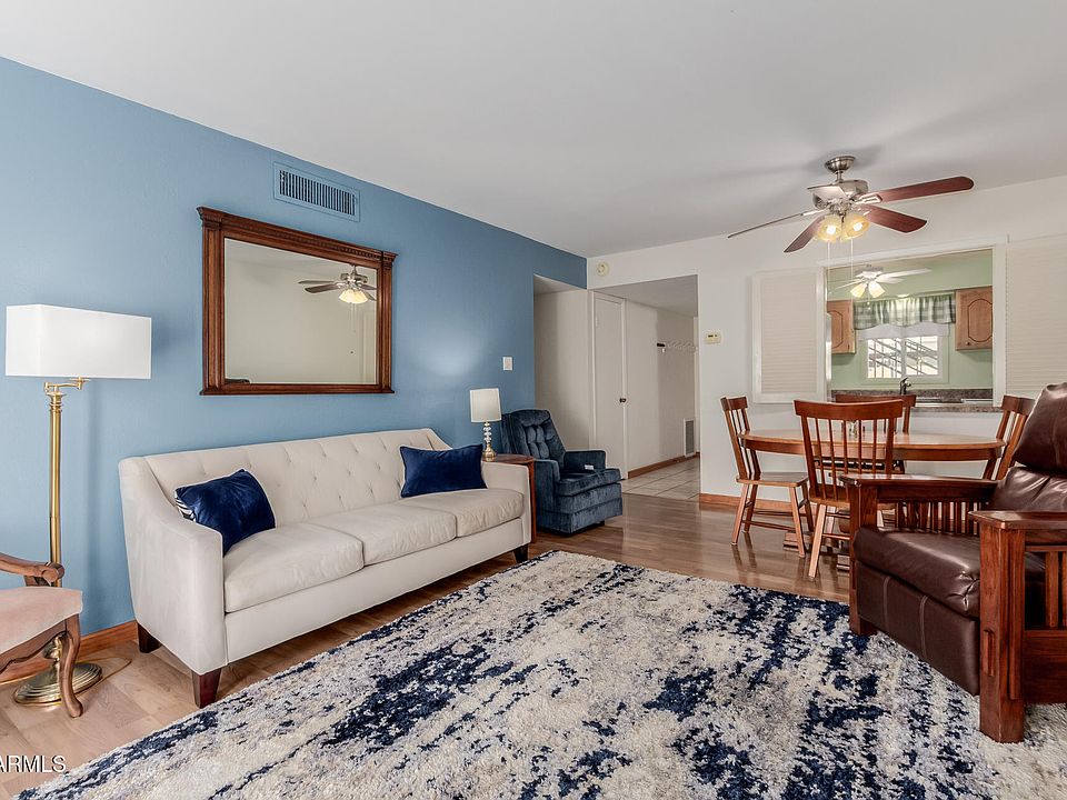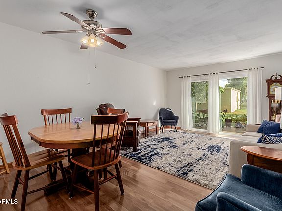 Welcome to this rare 2 bed/2 bath, FURNISHED first floor condo in 55+ community surrounded by mature trees and lush green landscaping. The home features wood laminate flooring in the main living areas and plush carpet in the bedrooms, creating a perfect blend of comfort and style. The newer dual pane windows and patio door provide energy efficiency and natural light, while ceiling fans throughout keep the home cool and comfortable. Both bathrooms have been beautifully remodeled, with the master ensuite offering a brand-new walk-in shower. The private patio will be a favorite place to enjoy the Arizona weather while relaxing or entertaining guests overlooking lush green grass. Also the carport has an attached storage unit, giving you extra space for belongings Step outside and take advanta of the wonderful amenities this community has to offer, including a sparkling pool and spa, pickleball courts, and a welcoming community center with activities and social events that make it easy to connect with neighbors. This is the perfect home for those seeking an active, low-maintenance lifestyle in a beautiful setting located near shopping, restaurants, hospitals, and convenient to freeways.