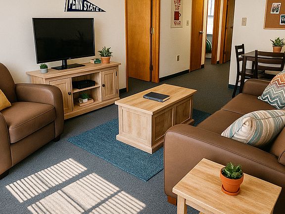 This furnished apartment has 3 bedrooms and 2 bathrooms and is located within easy walking distance of downtown State College and Penn State campus. Wheelchair accessible with proper ADA compliancy. Washer and dryer hookups available, with easy access to a public laundromat.