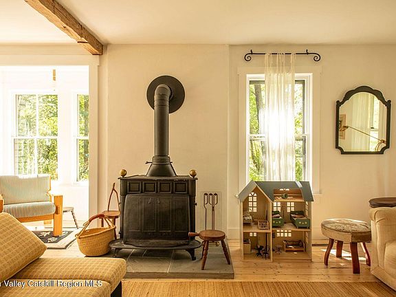 On a beautiful drive along the Hudson River you'll find 131 Northern Boulevard, an incredibly charming c1880 farmhouse on one of the best roads in the Valley just minutes to Germantown. Classic proportions are accented by fun finishes chosen by Tandem Design. The house was recently featured in Architectural Digest. You'll find the original wide board pine floors and exposed beams and columns in the mostly open space, nods to the home's historic past. And the bespoke kitchen is all new with maple front cabinets, wave quartzite countertops in a rust-colored hue and vintage metal pulls. The home's original woodstove is still in place and cranks. On the first floor there is a full bath and a lovely office/media room tucked off to the side. Upstairs you'll find three bedrooms, all with their own personalities and all nicely sized with vintage art deco lighting and hand forged iron curtain rods. A full bath on the second floor has two antique pedestal sinks, a soaking tub, and a wonderfully large shower. The attention to detail is outstanding but the home is lighthearted and designed to be enjoyed. The backyard gets excellent sun exposure and abuts open field. 131 Northern Boulevard is your quintessential Hudson Valley farmhouse with spunk, just 10m to Amtrak and 2h to NYC.