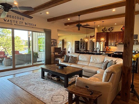 Located in the hidden, gated community of Sendera Ridge, this is the one Lake LBJ property that you can't afford to miss! With attention to detail obvious from the moment you arrive, this 1+ acre oversized lakeside oasis boasts 115 feet of E facing open waterfront and combines expansive, gently sloped Zoysia turf areas with thoughtfully xeriscaped habitats boasting unique flora. Inside, the designer touches surround you, including tiled and hardwood flooring, Hunter Douglas/Top down/Bottom up window coverings, and tasteful furnishings that can be negotiated as part of the sale for those looking for a true 'ready to move in' experience. Each of the 4 BR's has its own private full bath, and 2 of the guest BR's can be configured as a suite with separate entrances. The beautiful master suite has breathtaking lake views, and an expansive walk-in closet drenched in natural light from a large window. A corner tub is bathed in natural light and there is a large walk-in shower as well in the MB. The game/media room has its own wet bar and refrigerator along with a tap for your fave beverage and barn doors for privacy when desired. In addition to the main house living areas, there is a bunk room for those summer overflow weekends.. Lakeside, the 2 slip boat house has room for all of your lake toys plus a large party deck above. This represents an exceptional opportunity, so call for your viewing appointment today!