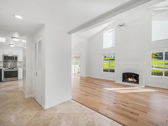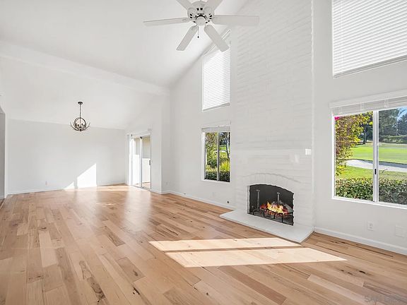Sweeping Golf Course Views in a Prime Location! Discover this fabulous single-level condo, perfectly situated with stunning fairway views of the prestigious Loma Santa Fe Golf Course. Nestled in a prime cul-de-sac location, this home offers the perfect blend of tranquility and convenience. Step inside to a bright and open floor plan, freshly painted and thoughtfully designed with vaulted ceilings and warm wood floors. The inviting eat-in kitchen boasts stainless steel appliances, ample counter and cabinet space, and a cozy fireplace, creating the ideal setting for relaxation and entertaining.