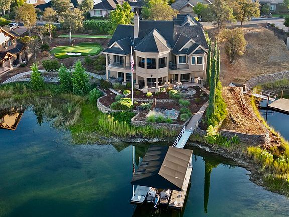 Welcome to the Gypsy Camp Lodge, situated within the Peninsula Estates gated subdivision on Lake Tulloch, uniquely located within the lake's 5-mile speed zone. Featuring 6,072 sq ft of living space, with a massive 1,058 sq ftt 4+ car garage. It offers extensive accommodations including four en suite bedrooms, a dedicated office, & a shark tank'' bunk room located above the garage, complete with full bathroom. Designed for luxury entertaining & convenience. The gourmet kitchen features Walnut floors, Granite counters, & Alder cabinets, outfitted with top-tier Wolf & Sub-Zero appliances, including three ovens, a 6-burner Wolf stove with a griddle, dual dishwashers, microwave, warming drawer, & a pot filler. Also includes two sink areas, a stainless steel stove hood & a custom backsplash inspired by Georgia O'Keeffe's Red Poppies. A large walk-in pantry, a breakfast bar seating six, separate dining area, & a built-in corner desk complete this culinary hub. Nearby, a wet bar with a wine fridge & dining area offers stunning lake views & access to a covered patio. The main floor laundry room is equipped with cabinets, a fridge & a laundry sink. For accessibility, an elevator provides access to the lake level. A striking Great Room is the heart of the main floor with 15′-high walls of folding glass doors that open to the upstairs porch. The room boasts Walnut floors, a wood-burning fireplace with stone hearth a gas starter, built-in cabinets, & a vaulted ceiling with open trusses. The Primary Bedroom features a seating with beautiful lake views & 8′ x 10′ sliding doors that lead to the deck. Primary Bath provides a soaking tub, steam shower, toilet area, double sinks, & dual entrances to the walk-in closet w/ built-in drawers & shelving. The office is designed with both interior & exterior doors, a large built-in desk, & bookshelves, offering privacy & convenience. The Lake Level is dedicated to guest comfort & recreation, featuring three large bedrooms, all with en suite baths. A secondary kitchen area includes refrigerator drawers, Granite counters, a double sink, & a dishwasher. Entertainment is centered in a large game room with a pool/ping pong table. This level also features a full bathroom with interior & exterior access to a private exterior shower, & a secondary laundry area behind double doors. The Lake Level Exterior features ceiling fans, ceiling speakers, several lakeside seating areas & a large gas-ignited fire pit with a fire ring. The area is wired for 220 volts for a future spa installation. Crucially, the dock is entirely accessible from the front door, with no steps & features an electric boat lift, canopy, lighting, electric plugs, & speakers. The home's mechanical systems include a central vacuum, two hot water tanks, & zoned furnaces. The property features a large, totally gated concrete courtyard with an automated gate & a spacious 1,058 square foot, 4+ vehicle garage with built-in cabinets.