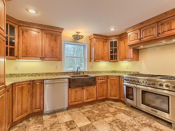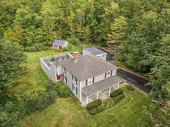 Old Charm with Modern amenities describes this Covered Front Porch Colonial with a 24 x 24 Rooftop Deck overlooking 10 +/- private acres, owned and lovingly cared for by the same family for over 50 years, don't let the age of this home fool you! Stunning custom gourmet kitchen with granite counters, custom wood cabinets, banged copper farmers sink, stainless steel Thermador appliances - propane range is 48 inches, double ovens, 6 burners and griddle- recessed lighting, under cabinet lighting, ceramic tile flooring- great design for prep and entertaining. Fireplace in dining room with wood stove and exposed antique wood beams and ceiling showing the homes charm. Updated first floor bathroom with Jacuzzi Tub and cathedral ceiling. Second floor features Master Suite w/changing area and full bath, separate laundry room. Brand new septic. Newer boiler, hot water heater, roof, paved driveway. Basement has a see through fireplace.