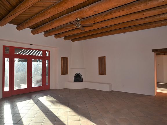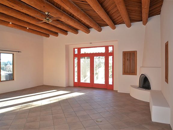 PRICED TO SELL: (below March 2018 appraisal) Lovely 12-acre horse property in exclusive Los Vaqueros community 20 minutes from the Santa Fe Plaza. (Only 5 minutes to local shopping and services in Eldorado). This architecturally unique 2074 sqf home features a dramatic great room w/kiva fireplace, a split cedar ceiling and vigas. The great room separates 2 very private bedroom/bathroom wings. Master suite has its own office area and opens onto a bricked terrace. The second bedroom opens onto a walled courtyard. Kitchen has excellent light, newer stainless steel appliances and plenty of room to cook. Newly painted throughout. Newer roof, stucco, hot water heater, boiler for radiant heat, and high efficiency washer and dryer. Newer 2-stall horse shelter with corral and feed storage. Front courtyard is fully landscaped with flagstone steps and multi-species cactus installation. Property has rolling terrain, abundant trees, special rock outcroppings and easy access (ride/walk/hike) to nearby wilderness areas and open spaces. Many homes in the community are appraised at more than $1 million. Buyer can add a studio/workshop or build their dream house --much of the acreage is buildable.