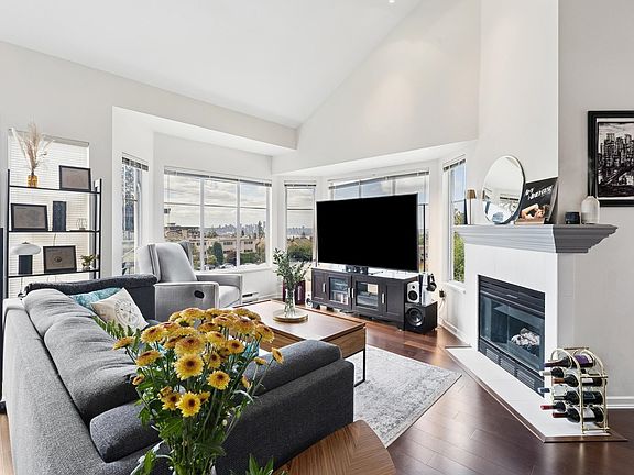Rarely available loft living in the heart of Central Lonsdale. This penthouse at boutique ‘Vista West’ offers 1,054 sqft of bright, well-designed living w/ 2 beds & 1.5 baths. Soaring ceilings, southwest exposure & bay windows fill the home w/ light, while rich hardwood floors, nat-gas fireplace & a south-facing balcony add warmth & comfort. The updated kitchen feats quartz counters, stainless appliances & mountain views. The loft-level primary has a full ensuite & access to a private rooftop deck to enjoy morning coffee & sunsets. Great insuite storage incl laundry/pantry closet w/ custom built-ins. XL parking & storage locker. Enjoy walkable access to parks, dining & shops, w/ easy access to Hwy 1. Thoughtfully designed living in one of North Van’s most connected & livable communities.