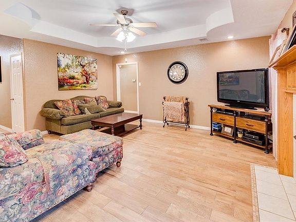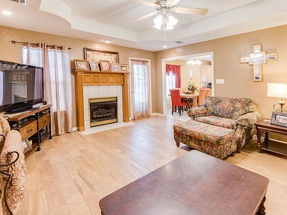 Beautiful 3 bedroom, 2 bath home with gorgeous tile entry and 10 ft ceiling. Home has tile throughout, eat-in kitchen with breakfast bar and pantry, formal dining or office with built in. Large living room with gas log fireplace, master suite with jacuzzi tub and separate shower. Main bathroom has large linen closet, front bedroom has vaulted ceiling (bedroom chandelier does not convey). Home has 4 linen closets! Large privacy fenced backyard, all on a corner lot! This home is simply adorable!