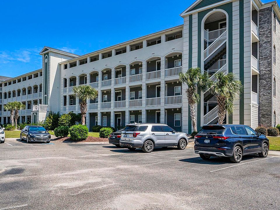 This elevator-accessible 3-bedroom, 2-bath condo is located in the gated community of Carolina Yacht Landing. The open layout features hardwood floors in the main living areas, carpeted guest bedrooms, and plenty of natural light. A beautiful extended arched bay window, crown molding, and a corner column add elegance to the living room. The spacious kitchen includes stainless steel appliances and ample cabinet and counter space. The large master suite offers his-and-hers closets and private access to the balcony, which overlooks a peaceful pond and fountain, and also accessible from the living room. Guest bedrooms are roomy and feature plantation shutters. A full-size washer and dryer convey; HVAC and water heater are approx. 5 years old. This condo is ideal as a primary residence, vacation getaway, or investment property. Carolina Yacht Landing offers a pool, hot tub, boat parking, available boat slips, and security patrols, and just minutes from the beaches, golf, shopping, and dining that the Grand Strand has to offer.