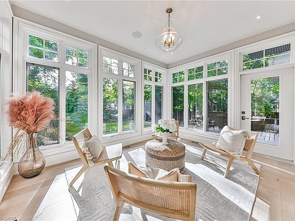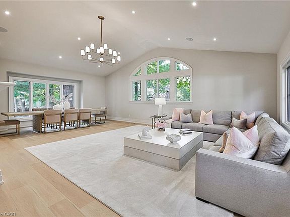 This spectacular residence has been completely renovated to the studs with high-end finishes and a thoughtfully reimagined floor plan, blending timeless elegance with modern functionality. Situated on a premium 75x150 south-facing rectangular premium lot, this home is just a short walk to Oakville's top-rated schools.The exterior showcases new stucco with natural stone accents, oversized windows, and stunning curb appeal. Inside, the open-concept design features a grand living/dining room with soaring 13-ft ceilings and wood-burning fireplace, seamlessly flowing into a brand-new custom kitchen and family room. The chefs kitchen offers a massive center island, custom hardwood cabinetry, top-of-the-line appliances including a Wolf stove and Fisher & Paykel fridge, and walkout to a sun-filled cedar deck. A beautiful sunroom with full HVAC brings the outdoors in, overlooking landscaped gardens, mature trees, ponds, and stone pathways. The upper level features double primary suites with spa-inspired ensuites, heated floors, and walk-in closets, providing exceptional comfort and flexibility for families. Designer details throughout include custom millwork, accent lighting, hardware, California shutters, and premium hardwood flooring. The fully finished lower level offers a nanny/in-law suite with in-floor heating, recreation space, and plenty of storage. Recent upgrades include new spray foam insulation, new electrical panel, sump pump, tankless hot water system, pot lights, built-in speakers, and luxury designer tiles in all bathrooms. This one-of-a-kind home is the perfect blend of modern luxury, refined craftsmanship, and family-friendly living, a rare offering in one of Oakville's most prestigious neighbourhoods.