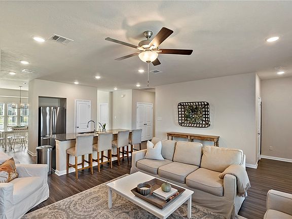 Like-new 3BR/2BA home in the desirable Edgewater Community! This upgraded home includes a refrigerator, a washer and dryer, a SimpliSafe security system with a camera doorbell, a full sprinkler system, an automatic garage door opener, upgraded cabinetry in both bathrooms, blinds throughout the home, and all hanging curtains. The open-concept layout features a spacious kitchen with granite countertops, stainless steel appliances, a microwave, and a decorative tile backsplash. The primary suite offers a dual vanity, walk-in shower, soaking tub, and large walk-in closet. Enjoy natural light, ceiling fans in every room, and no rear neighbors for added privacy. Set on a 6000 sq. ft. lot with beautiful landscaping, a welcoming back porch, and an oversized driveway. Edgewater amenities include a park, playground, basketball court, pavilion, fitness areas, and walking trails—all just minutes from Texas A&M, Shopping, Legends Event Center, and Traditions Golf Course.