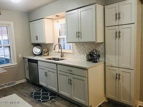 Charming Cape Cod w/ 4 beds 2 full baths. Main floor Master. Possible 5 bedroom home if needed. There is over 2300 sq ft of finished living area that has been recently updated. Lovely new kitchen w/ quartz counter tops, herringbone bksplash, stainless appliances (gas range on order). Beautiful laminate floors throughout the main area, all new updated baths, newer roof and replacement windows, new lighting and doors throughout. Living room has cove ceilings wood burning fireplace and built in cupboards. Large finished rec room down. Large deck off the family room 1 car garage has an additional workshop area on the rear or possible 2 car. Partially fenced in back yard.