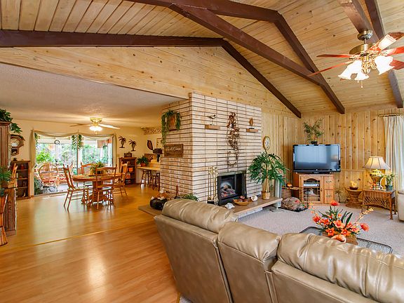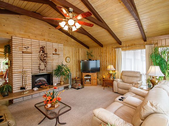 Absolutely spotless and move-in ready! This single-level 3-bedroom/2-bath home on a corner lot close to town has an functional floor plan. Upon entering the front room you will find walls lined with beautiful blonde tongue & groove solid wood, high beams, and tall windows to let in all the light. The fireplace with electric insert framed in brick make for a cozy winter night. Additional features include the built-in china hutch in the dining room, the breakfast bar for hanging out in the kitchen during meal prep, under-cabinet lighting, wall oven with separate cooktop, and huge pantry with tons of storage. The convenient laundry with additional storage is also located in the kitchen area. The master features dual closets plus a slider to its own private outside sitting area. Outside you'll find an attached 2-car garage, unique above-ground pool, covered RV/boat parking, an enclosed sunroom, and a low-maintenance landscaped back yard. Fidelity 1-year home warranty included. Must see!