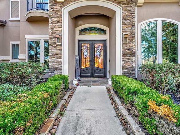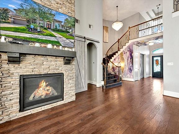 Welcome to this stunning 5-bedroom,5 1/2 bathroom custom Partners in Building home in highly desirable West Ranch community of Friendswood. This residence offers elegance and functionality with soaring ceilings. an open-concept layout blending the kitchen and living space in harmony with beautiful cabinetry and a huge center piece island for family gathering. The home offers multiple living spaces including the main living space with a 23' floor to ceiling rock fireplace with large windows to view the large 48 foot long pool.