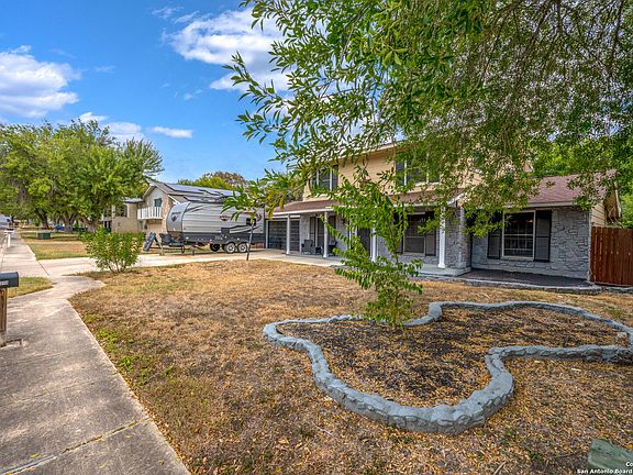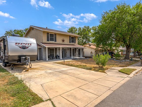 Move-in ready home offering just under 2,000 sq. ft. with 4 bedrooms and 3 full baths. This property features two primary suites-one upstairs and one downstairs-ideal for multi-generational living or guest privacy. Interior has been freshly updated with new paint and flooring throughout, and no carpet anywhere in the home. Situated on an oversized lot just under 1/4 acre, the backyard is an entertainer's dream with a large, covered patio featuring built-in skylights, an 8-ft deep pool recently repainted, and a built-in outdoor shower for convenience. Located minutes from shopping, dining, and everyday conveniences, with easy access to Loop 410, Hwy 90, and Loop 1604. This home combines modern updates, space, and an excellent location - a must-see!