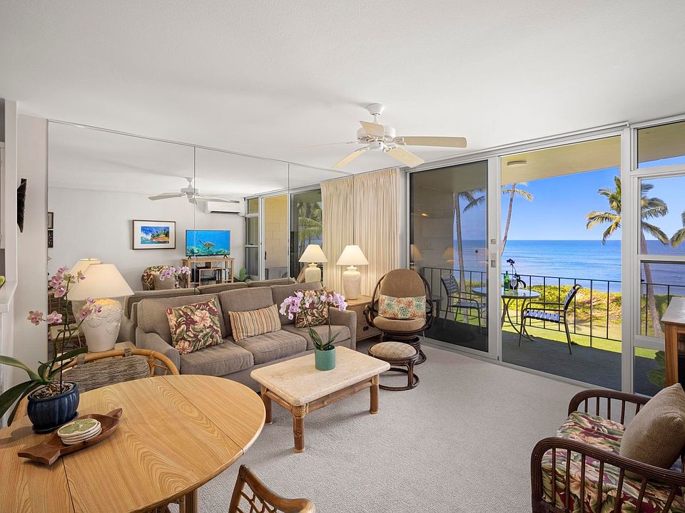 As you enter this top 3rd-floor unit (with no one above), you will be drawn to and amazed by the expansive mighty blue Pacific ocean and outer island sweeping view(s)! Enjoy balmy breezes, swaying palm trees coupled with turtle gazing and "best in the world" glorious sunsets, all while dining on your own private lanai. Some of the features offered in this comfortable condo apartment are: split system dual air conditioner, top of the line Fleetwood low E double pane sliding patio door, sliding windows with Skandia Shutters, custom built-in closet drawers and shelving unit, Cal king bed, dishwasher, upgraded stainless appliances. This complex includes a swimming pool, shuffleboard, BBQ area, onsite laundry facilities, cable, direct beach access, extensive grassy area for lounging. Future bookings may transfer to new owner. Hale Kai O Kihei is a low density Beachfront property, in one of the most sought-after white-sandy beach locations of South Maui. Hale Kai O Kihei has long been favoured by savvy visitors and locals, due to its ideal location on a quiet oceanfront street, in the midst of everything Kihei has to offer, yet seemingly a world away. With unobstructed ocean view corridors, it is the ideal locale from which to enjoy year round picture-perfect sunsets, long romantic beach walks, seasonal whale watching, convenient ocean access for launching your choice water sports activity, imbuing a low-key relaxing ambiance. Delightful oceanfront location, yet walking distance to shops, restaurants, supermarket, medical facilities and much more. Now is your time to own a little piece of Hawaiiana paradise.