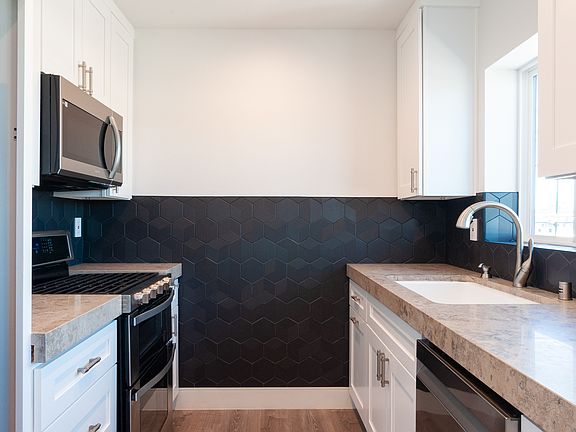 Designer quartz countertopsWalk-in showerBrand new vinyl flooringAmple area for storageGas lg rangeRefrigerator and freezerSpacious galley kitchen