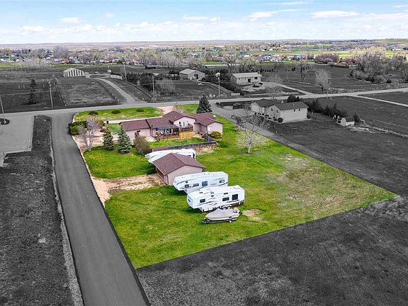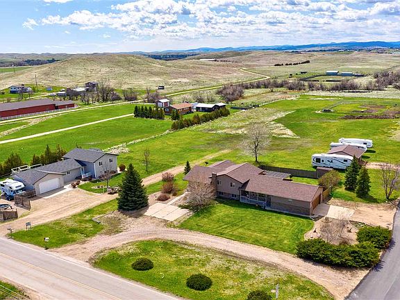 Property Presented by Ashley S. Goodrich at RE/MAX In The Hills (605) 645-247. This is a VERY unique and beautiful property on a little over an acre and located in Belle Fourche. This 4 bedroom/4 bathroom home will impress you as you enter and are greeted with beautiful tile work in the entry, wood flooring, vaulted ceilings, neutral paint colors, plush carpeting, warm custom wood work and great space to enjoy! This ranch style entry is inviting, offering an open and large living room area, the dining room space and the gorgeous kitchen which features lovely oak cabinetry and stainless steel appliances. Entertaining would be effortless in the multi-level home with options for gathering in a few different locations inside and outside the home. There is a large family room on the lower level with a warm gas fireplace situated nicely in the corner of the room offering that extra supplemental heat in the cold winter months. You will find three bedrooms on the upper level which includes the master suite and the 2nd full bathroom with a shower/tub combination. The lower level provides the 4th bedroom and the 3rd bathroom. You can find the 4th bathroom (walk in shower) in the easterly side of the property. This attached space is currently an office type setting and has a separate entrance. Very unique space that may offer many opportunities and wonderful ideas for future use. There is an attached two car garage and a separate 2 car garage on the south side of the home.