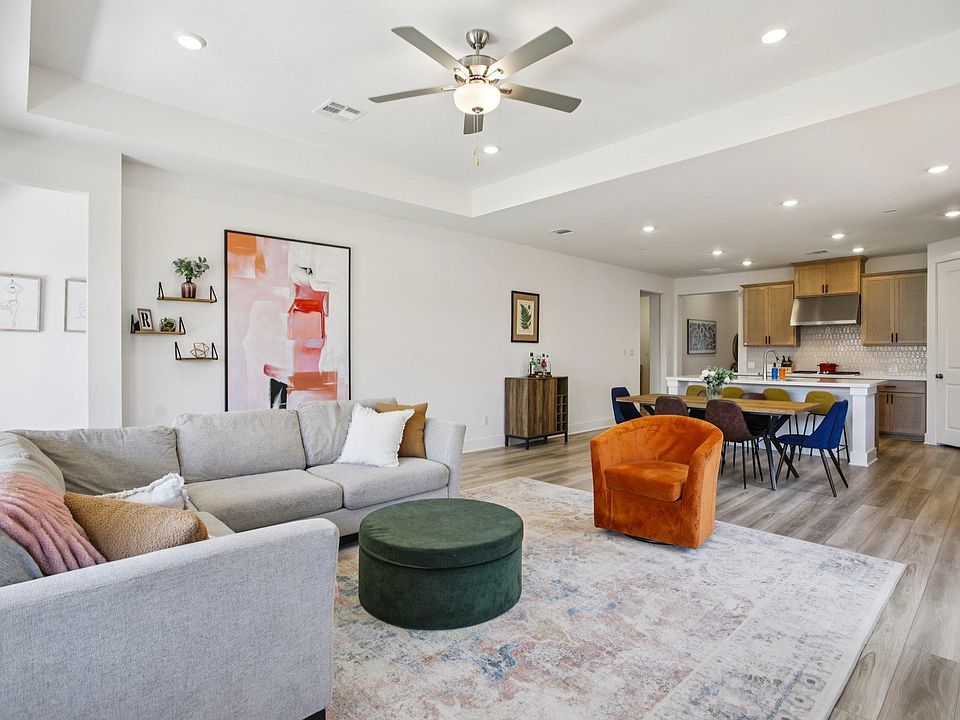 Timeless cabinetryRecessed lightingWood-look vinyl plank flooringBuilt-in buffetNatural lightCovered patioFenced backyard