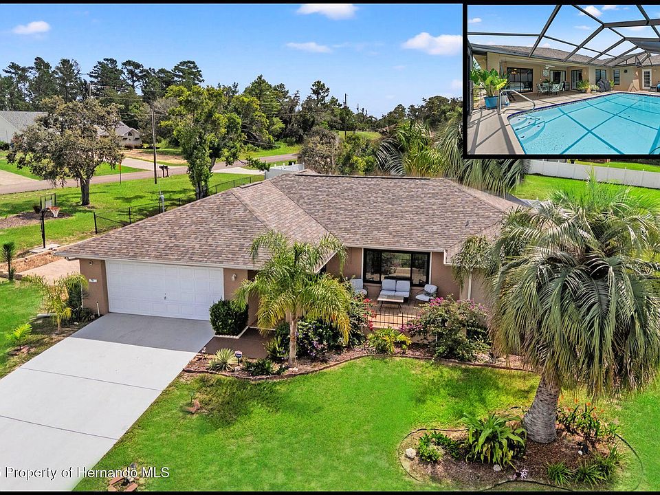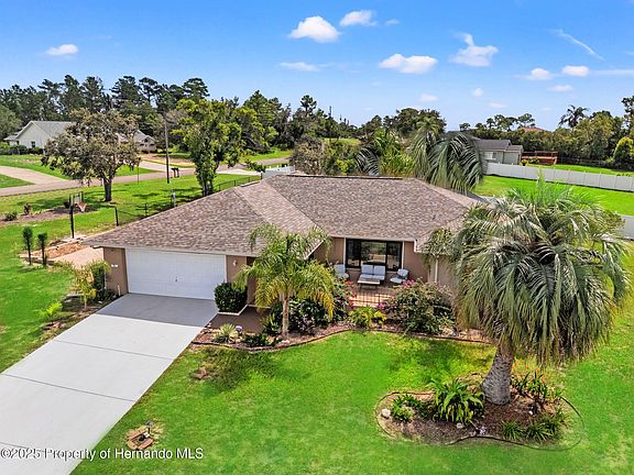PRIVACY + HEATED POOL + HALF ACRE CORNER LOT + FENCED YARD + RENOVATED KITCHEN + BASKETBALL COURT + NEW ROOF 2019 + 4 BED / 3 BATH + NO HOA. Set on OVER A HALF-ACRE in 34609, this Spring Hill home built by ARTHUR RUTENBERG brings together the big features you want: a screen-enclosed 14' x 28' HEATED POOL, RENOVATED KITCHEN, PRIVACY-FENCED CORNER LOT, and a BASKETBALL COURT—with the Suncoast Parkway on-ramp just 5 minutes away for easy Tampa access. Start your day in the front courtyard—a sweet spot for morning coffee—then step through the covered entry and double doors into formal living and dining rooms that feel warm and welcoming. The RENOVATED KITCHEN is truly the heart of the home with QUARTZ COUNTERS, a SUBWAY TILE BACKSPLASH, NEWER APPLIANCES, tons of bar seating, and a large dinette for everyday meals. Inside is NO CARPET—TILE THROUGHOUT for easy care, plus a huge indoor laundry room with shelving and a utility sink. Smart split-bedroom layout: Bedrooms 2 AND 3 share a FULL bath, while Bedroom 4 sits toward the back with its own entrance and full bath—ideal for guests, multigenerational living, or a private office. The primary suite features a large walk-in closet and a double-sink bath. Out back, a large under-roof lanai overlooks the HEATED POOL and yard—perfect for grilling, game days, pets, gardens, and that hoops court. The yard is huge (over half an acre), giving you room to spread out, play, and enjoy the Florida lifestyle Big-ticket items are handled: NEW ROOF (2019), CHILD SAFETY FENCE FOR THE POOL, NEW SEPTIC DRAINFIELD IN 2018, NEW POOL HEATER IN 2024 and NEWER APPLIANCES. Even better—NO HOA, NO CDD, and NOT IN A FLOOD ZONE help keep costs down. Location is a win: close to the Suncoast Parkway on-ramp—about 45 minutes to Tampa for pro sports, concerts, the Riverwalk, and Tampa International Airport. Nearby Spring Hill keeps shopping, dining, parks, and medical close; weekends are easy with Weeki Wachee Springs, Hernando Beach, Homosassa, and Gulf sunsets all within 20 minutes. YOU WILL WANT TO SEE THIS ONE IN PERSON.