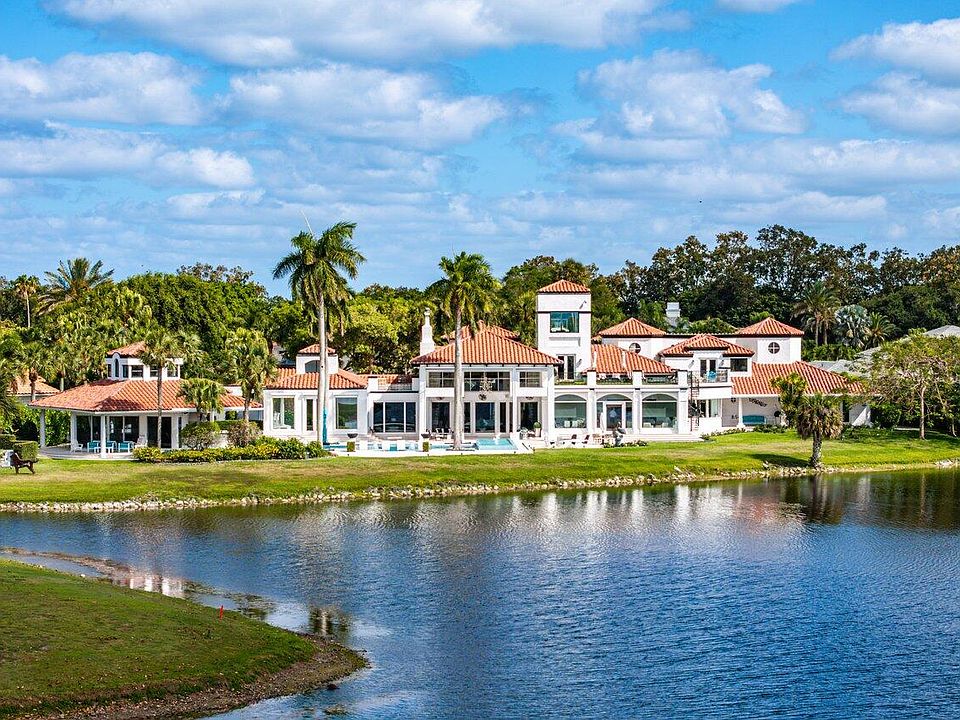 Proudly offered on a premium one acre double lot this stunning estate delivers over 12,000 sq. ft. of refined luxury living with breathtaking wraparound lake and golf course views framed by Florida's signature sunsets in Frenchman's Creek. Over the last few years this spectacular home has been fully renovated and modernized while still retaining its majestic charm. As you step inside this truly unique renovated estate offering 7 generously sized bedrooms and 8.5 bathrooms, gorgeous marble flooring leads your eye to soaring volume ceilings with stunning wood beams and classic architectural details with walls of windows open to the spectacular views and an abundance of natural light. The luxurious primary suite encompasses the entire east wing of the home serving as a private retreat featuring a spacious sitting area, generous storage with multiple walk-in closets, and a serene spa-like bath with dual vanities, two water closets, separate tub and shower, and tranquil courtyard garden views.