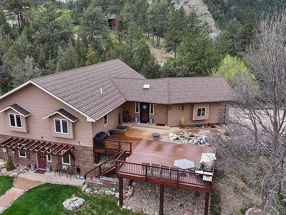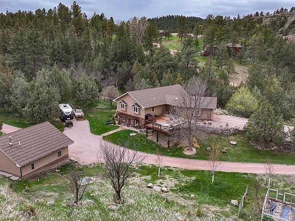 Listed by Bobbi Ternes 605-390-1941 Located just 2.5 miles from Hot Springs, this property offers serene living in the Black Hills, with quick access to Angostura Reservoir, Custer, Rapid City, and Mount Rushmore. The home features two garages, including a detached one with a full bath and plenty of storage. An RV hookup with electric and water is also available, with space to build a shop if desired. The property boasts a fireproof roof with a 75-year warranty. The main level offers ranch-style living, featuring a master bedroom with an en-suite bath and soaker tub, an additional bedroom, and a living room with vaulted ceilings and large windows. The inviting kitchen includes granite countertops and knotty alder cabinetry, while the living room centers around a beautiful stone-faced gas fireplace. The walkout basement offers a wet bar, gas fireplace, two additional bedrooms, a full bath, and ample space for guests. This property blends comfort, convenience, and natural beauty, making it an ideal retreat.