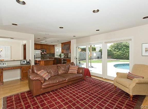 This home is a must see! Two-Stories, in Tustin, with a newly remodeled granite kitchen, stainless steel appliances, 2 ovens and cherrywood cabinets. From the open kitchen and granite island, you have views of the backyard and pool area through a beautiful, bay window in one direction and the family room, with surround sound, in another. Very open and spacious. One bedroom is downstairs and 3 bedrooms up. (downstairs bedroom is currently being used as a bedroom/office, but can easily be converted back to a bedroom by adding closet doors). Newly remodeled bathroom downstairs w/ granite countertops. Two of the bedrooms upstairs are adjoined by a Jack & Jill bathroom. Updated pool design, re-plastered and new pool equipment within the last few years. Very private backyard, the houses behind are 1 story. Recessed lighting throughout. White Oak flooring downstairs and carpet upstairs. Laundry room downstairs. Outside recently painted and newer rain gutters. Block wall fencing. 3 car garage with remotes. Backyard patio has BBQ hook-ups.