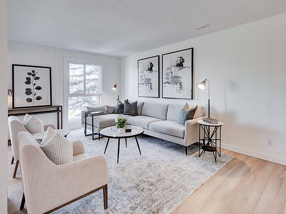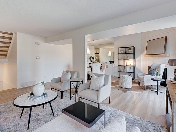 This stunning, exquisitely, expertly, renovated 1115 sq. ft. townhouse in the sought-after community of Canyon Meadows blends modern elegance with functional design. The bright, open-concept main floor showcases new wide-plank flooring, a designer kitchen with quartz countertops, a full-height quartz-inspired backsplash, gold accents, and a custom built-in nook with wine storage and extra cabinetry. Step out from the kitchen to your private deck, perfect for morning coffee or evening relaxation. Convenient in-suite laundry is also located on the main floor.