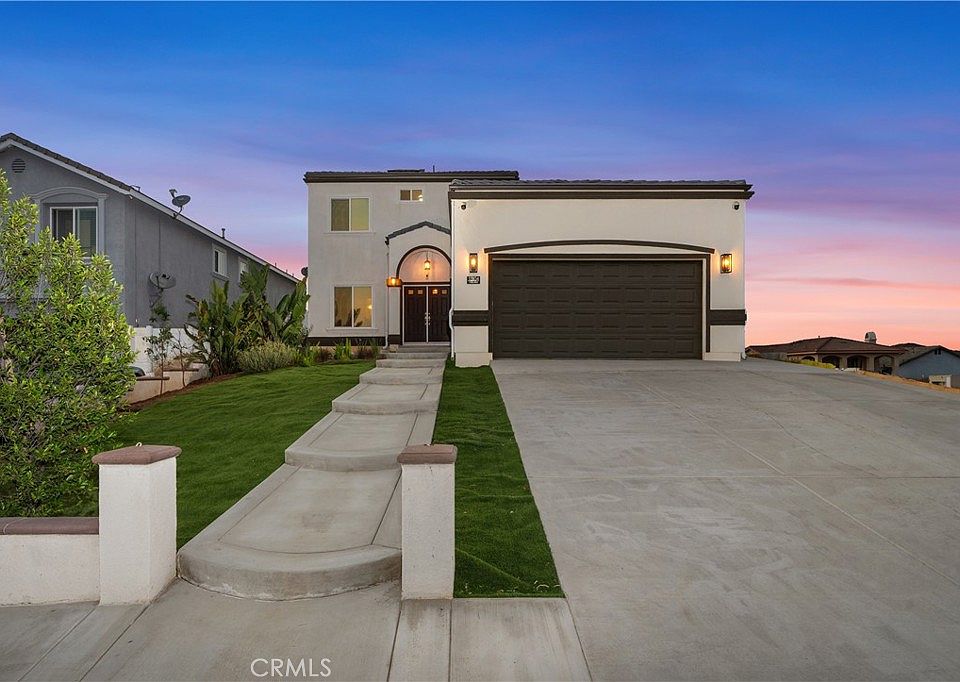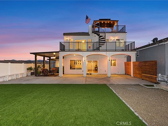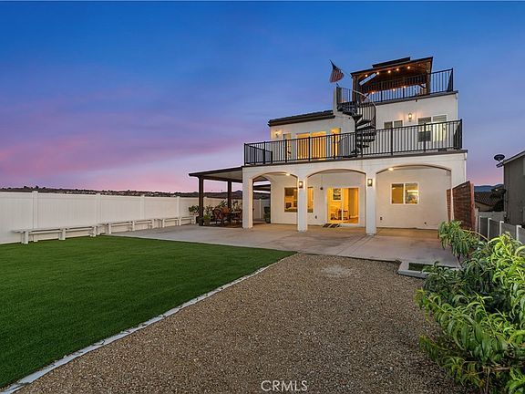 Welcome to the newly developing secluded neighborhood, Tuscany Village. This four bedroom three and a half bath two story home has been custom built and detail designed by its one and only owners. On this perfectly located lot you will fall in love with the endless amazing views this home has to offer. Approaching the home, pull on into the long driveway that provides over 6 parking spots and space for your RV. Enter the double front doors and be immediately greeted with a large entry way, high ceilings, open living concept, and the many windows providing the entire home with natural light and beautiful views. Downstairs you will find a private office that has been used as a library/sitting room with built in floor to ceiling bookshelves and seating. The kitchen offers a large island, large pantry, plenty of counter space and cabinetry, and is open to the dining area and family room with fireplace. Down the hall you are provided with tons of storage with pull out shelving as well as the spacious downstairs bedroom with an en suite bathroom that features a large step in shower. There is also a downstairs bonus room perfect for another office or playroom. Make your way up the stairs and find the separate laundry room with cabinetry, spacious two guest bedrooms with a connecting bathroom and the large primary bedroom. The primary bedroom offers an ensuite bathroom with double sinks, a large walk in closet, spacious step in shower, jetted soaking tub and many windows with beautiful outside views. Exit the sliding door from the primary bedroom to the huge deck and you will find a spiral staircase that leads to an amazing spacious roof top deck where you will be able to watch the sunset, sunrise and be mesmerized by the unobstructed endless views!!!! Step outside to the large backyard and extended patio area with new aluminum cover and ceiling fans perfect for entertaining. Around the home you also have many fruit trees including limes, peach and avocado. A few other features include privacy windows on the front windows of the home, new tankless water heater, several storage sheds on the side of the home, built in surround sound in the living room and so much more.
