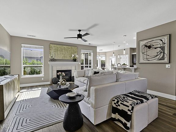 The kitchen is equally impressive, featuring newer KitchenAid appliances (2021)—double ovens, 5-burner gas cooktop, dishwasher, microwave, and refrigerator—along with a breakfast bar, dining nook, generous storage, and a custom pantry. Modern touches include Wi-Fi-controlled lighting and thermostat, Schlage smart front door lock, and Ring doorbell. With wide streets, sidewalks, parks, and trails nearby, plus quick access to outdoor recreation—20 minutes to world-class skiing, 25 minutes to Lake Tahoe, and 35 minutes to Reno—this home offers the best of Northern Nevada living.