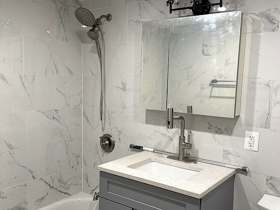 Modern fixturesSleek tile-workNatural lightIn-unit washer and dryerGenerous bedroomsQuiet tree-lined streetStainless steel appliances