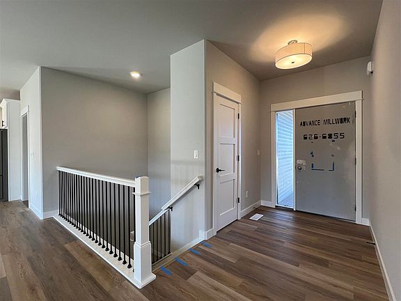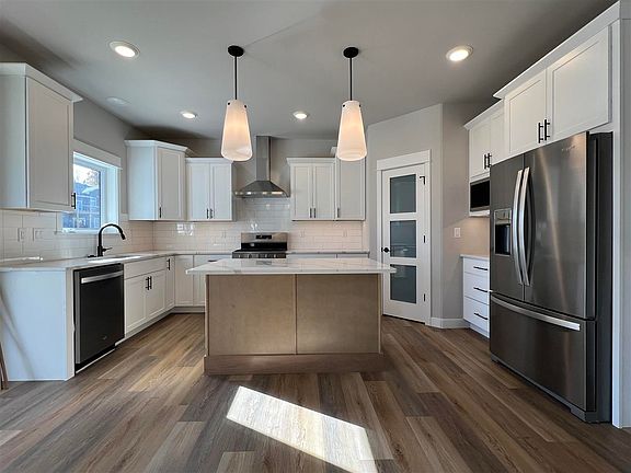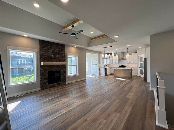 IMMEDIATE POSSESSION AVAILABLE! This spacious floor plan features a four seasons room with steps down to the back yard. Kitchen has white cabinets with an island, subway tile backsplash, hard surface counter tops, pantry, and stainless steel appliances with gas range with hood vent. White trim and white doors. Black hardware and lighting throughout. Upgraded Lighting Package. Great room with gas fireplace with stone surround. Primary suite has a trey ceiling, walk-in closet and a private bathroom with subway tiled shower and double sinks. Custom swing shower door installed. Walkout lower level has a family room with a snack bar with cabinets and sink, bedrooms 4 and 5, and bathroom. Madden Addition features a paved walking trail and pedestrian bridge that connects to the Clear Creek Trail System. Photos of the actual property.