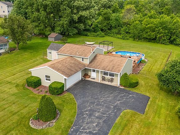 Welcome Home to this 3 Bed, 2 Bath split. Town of Henrietta w/ Rush Mailing Address. A true entertainers dream. Once inside the main level you are greeted by large Living Room, which is semi-open to eat in kitchen with breakfast bar. French doors lead you to the multi-level 24x26 deck and 15x26 above ground pool. Once upstairs you will find spacious owners’ bedroom, 2 additional bedrooms and full bath. The finished lower level (Renovation ’17), offers a gas fireplace, bar seating, laundry room and second full bath. This home has been meticulously maintained and is ready for its new owner. Fully Fenced rear yard with added entertaining space with fire pit. Updates include kitchen counters & SS Fridge ’17, Lower Level ’17, Siding & Roof 2011, Pool and Deck ’99, Shed 12x16 ’02, Garage Door ’19. Furnace & A/C 2006, Pool Liner ’16, New Siding on Shed ’24. Delayed Negotiations until Tuesday June 25 @ 3pm.