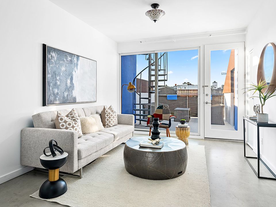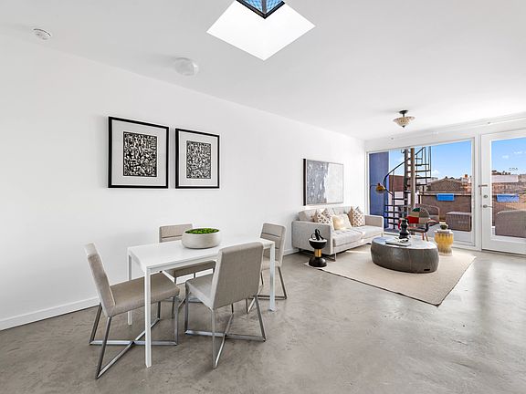 Loft inspired condo with *deeded parking spot included*, storage included and over 700 square feet of private outdoor space. Tax abatement until 2027. Welcome home to your penthouse apartment at the sleek and innovative 1311 Pacific Street condo complex. The private keyed elevator opens directly into your sunny one bedroom in the sky. Floor to ceiling sliding doors make indoor/ outdoor living feel like an extension of your entertaining space. Additionally, there is a spiral staircase to a second 500 square feet private roof deck. A blank canvas, the industrial chic concrete floor, newly updated, ties in perfectly with the modern finishes of the stainless steel kitchen. The aesthetic is crisp and airy with a skylight overhead adding sunny depth to the open concept. Pocket doors to the bedroom (king sized bed pictured) and bathroom maximize space leaving both feeling expansive and open. The bathroom has been updated with a spa-like overhead shower and new tiling throughout. The building amenities include a gym with weight machine, free weights, cardio machines, TVs to accommodate your virtual classes, as well as a laundry room in the basement with five washers and five dryers. Laundry and hot water are included in the low common charges. Commuting to Manhattan is direct with the A/C trains just 3 blocks away. Commuting out of the city, the LIRR is just around the corner. There is no shortage of restaurants, boutiques, banks, grocery, and supermarkets on the bustling Nostrand Avenue and Franklin Avenue in prime Crown Heights. The neighborhood outings are endless with the Brooklyn Museum, Botanical Gardens, Brooklyn Zoo, Brooklyn Public Library, Prospect Park, and the Barclay Center are all in your backyard.
