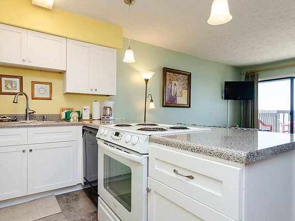 This one bedroom, one bath 3rd floor condo features an open floor plan with the kitchen, dining area, and living room all ocean front that lead out to the deck. The primary bedroom is street side with a Queen bed and there is a set of bunk beds nestled in the hall alcove.