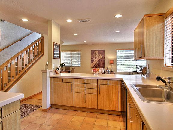 Spacious, sunny, freestanding townhouse lives like a single family home! Located a in quiet, convenient, cul-de-sac location next to lush Sycamore Creek. Main level: formal entry w/powder room; open Kitchen w/dining bar & Dacor/Bosch/SubZero appliances; Living Room w/wood floors, Dining area, gas FP, & sliding doors to an entertainers' patio. Upstairs: Master Suite + 2 other bedrooms & 2nd bath.