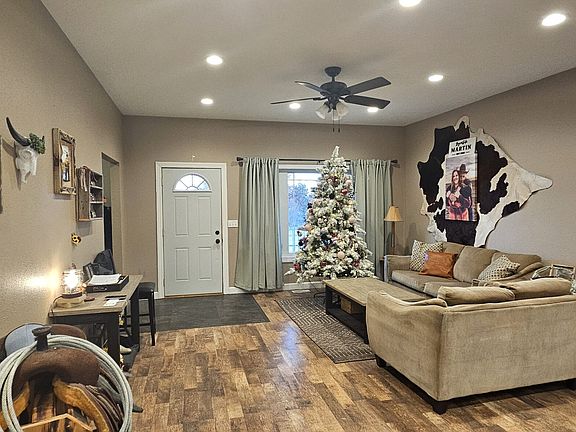 HORSE READY PROPERTY! This 4 bedroom, 3 bathroom home features 3,481 sq ft of living space plus a basement for storage! The front of the home has a covered front porch that enters into the family area of the home. On the main level there is a massive primary with walk through closet and ensuite, another full bath, office space, laundry room, kitchen, dining and living room area with 20+ ft high ceilings with multiple windows for natural light. Upstairs there is an additional loft style living space with 3 more bedrooms and a full bathroom. A new second AC unit was installed for the upstairs portion of the home. Outside is a deck area with built in seating and perfect for entertaining. As you walk out onto the land there is a brand new 45x22 metal lean to set up with 3 horse stalls, storage area and an enclosed tack room and a yard hydrant installed nearby. There is another outbuilding on the property as well currently used just to store hay. Come see this unique home and horse set up before it is gone!