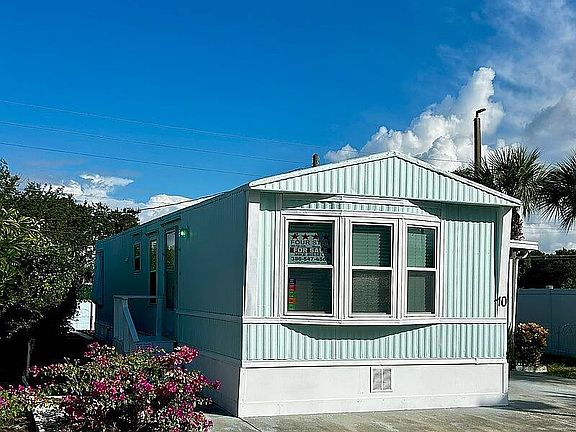Super Cute Home, both Inside and Out. Super Nice Screen Room Welcomes you. Great Outdoor Living Space. Secluded by the Boundary Fence on the West and North, and a Nice Hedge on the West. Complete with a small dog run, and 2 parking spaces. Home features, New Pex Plumbing, no Grey Pipe. Thermopane Windows, Newer Roof Coating, 2017 AC recently Serviced. Newer Flooring. Split floorplan. Also, newer Skirting and exterior paint. 2 Sheds for plenty of storage and only 2 Blocks from the NSB Police Dept. Low lot rent and Pet Friendly. She is a Beauty!