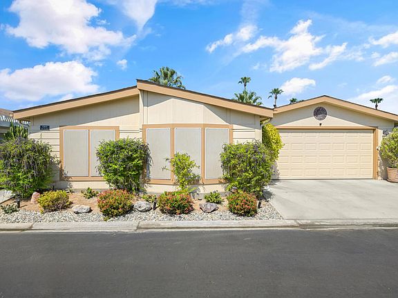 Welcome to this beautifully maintained single-level manufactured home with a 2-stall garage in the 55+ manufactured home community of Desert Sands. Built in 2006, this home is located in the newer home division of Desert Sands. It features new appliances, installed between 2018 and 2021, and includes an extra-large central AC unit. The living room flows into the dining area, and the kitchen features white cabinetry, stainless steel appliances, a center island, and a cozy breakfast nook surrounded by windows. This property includes two bedrooms plus a versatile bonus room that is ideal for a home office, hobby space, or guest area. The primary suite has an en-suite bath with dual sinks, and the secondary bedroom is serviced by a full guest bath. Enjoy the convenience of an attached garage and a spacious backyard with a covered patio, perfect for relaxing, dining, or entertaining. Desert Sands Mobile is known for its lush, year-round green landscaping, and vibrant community lifestyle. Community amenities include a pool, spa, and year-round activities. The location is superb! close to Eisenhower and Desert Regional hospitals, Palm Springs, Rancho Mirage, Palm Desert, and the airport. Don't miss the opportunity to make 1311 Via Playa your home sweet home!
