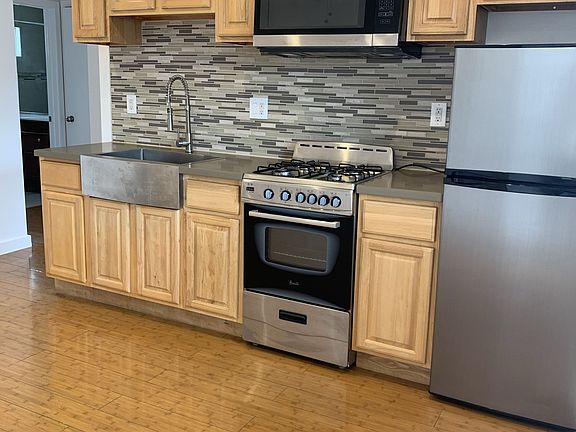 Modern efficient kitchenNew tilesLarge apron sinkEarth-toned back splashNew stainless-steel appliancesRecessed lightingBrand-new cabinets